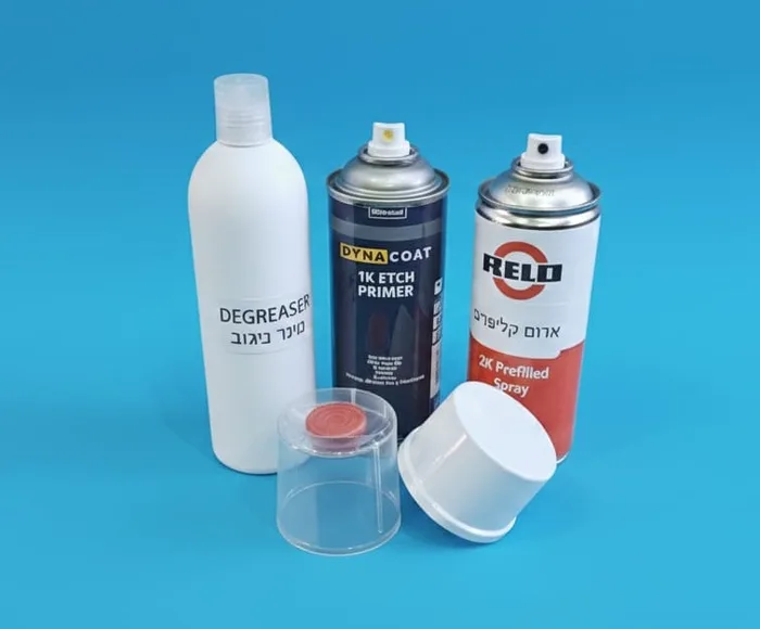 הפעלה חשובה (Activation): במיכלי 2K יש בדרך כלל כפתור אדום במכסה (כמו זה שבתמונה בתחתית המיכל) שיש להרכיב בתחתית המיכל וללחוץ עליו בחוזקה כדי לשחרר את המקשה לתוך הצבע.